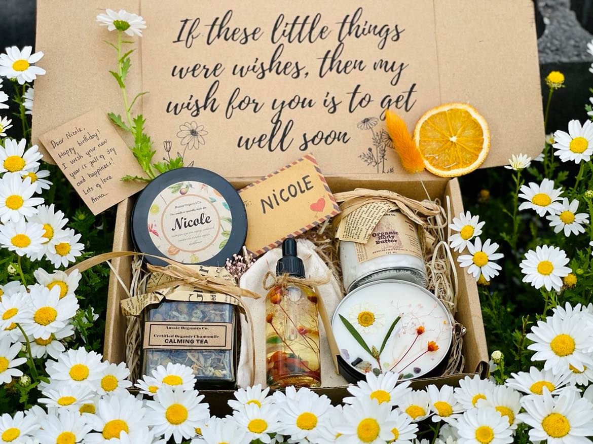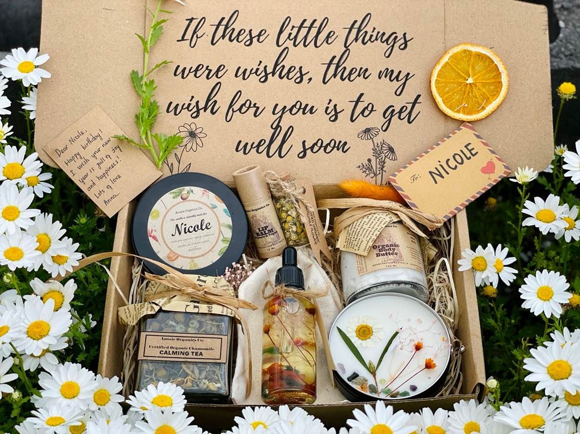 Personalised get well soon gift for her or for him. This self care gift box is 100% natural and organic, vegan, plastic- free and zero- waste.