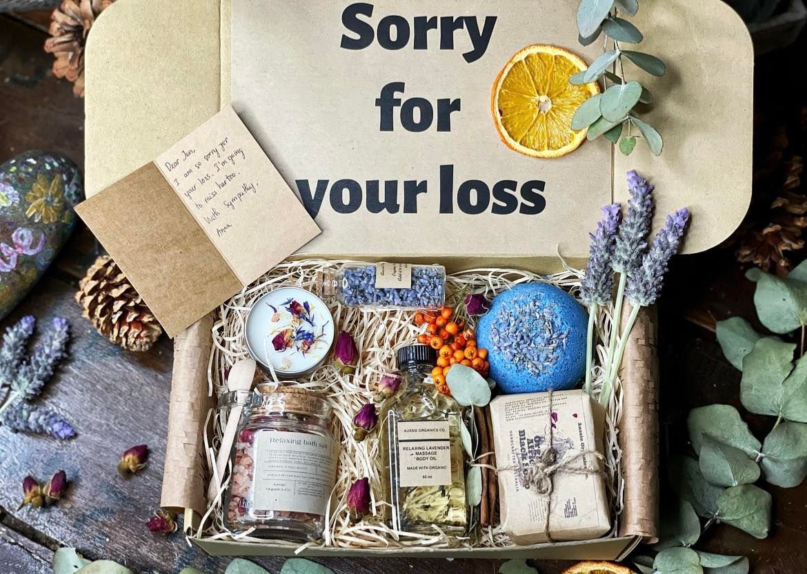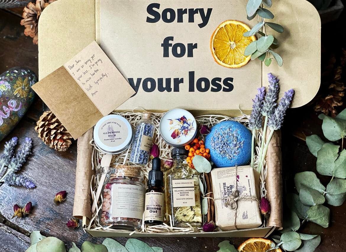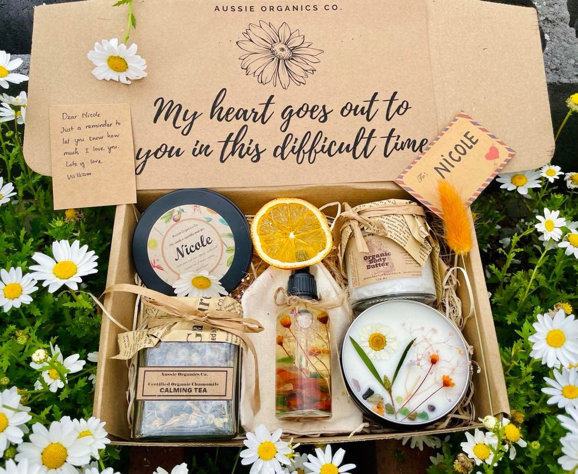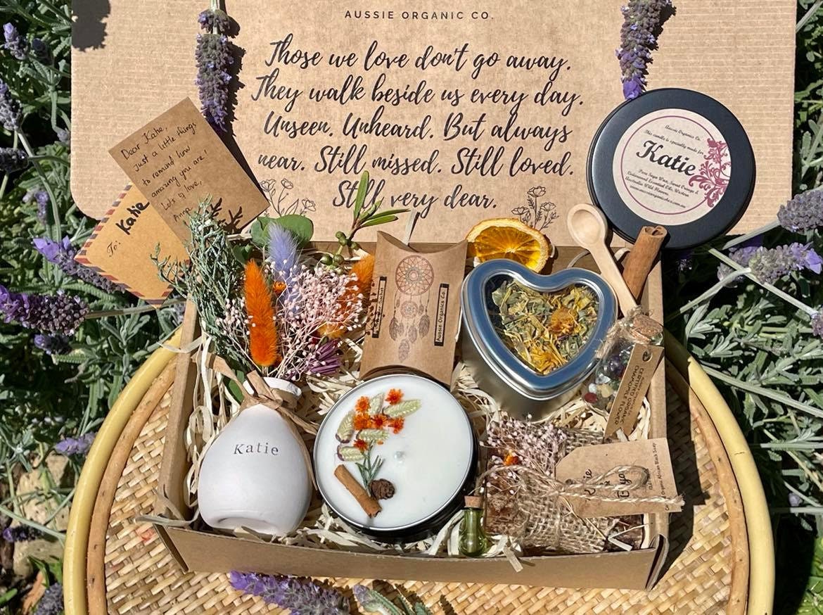 Personalised sympathy gift box with 100% natural, organic, plant based ingredients, plastic- free & zero- waste